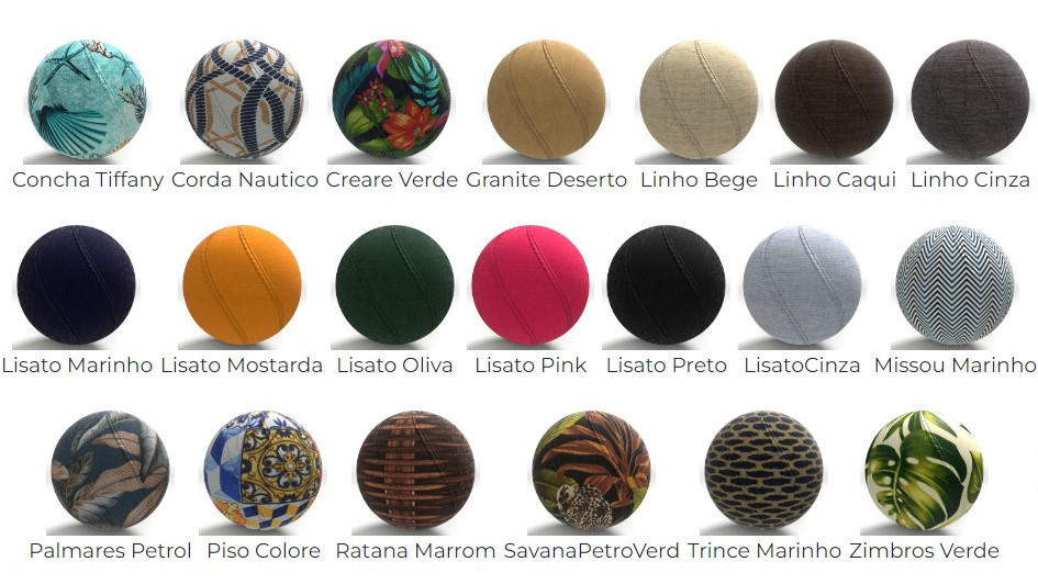 Brasilhereo bietet saisonal wechselnde nachhaltige Stoffe aus Garn und Leder an. Diese besitzen teils sehr farbenfrohe brasilianische Muster (siehe Bild 2 unten links) oder überzeugen durch eine gemütlich-einladende Lederhaptik (siehe Bild 3 unten rechts).